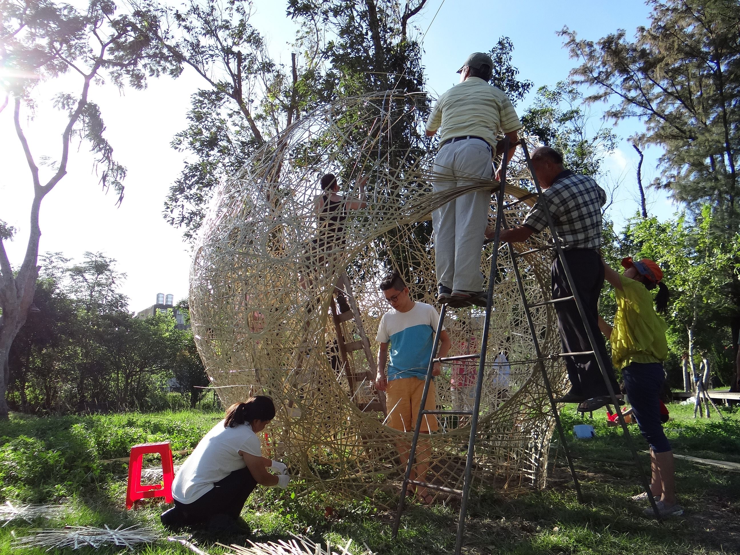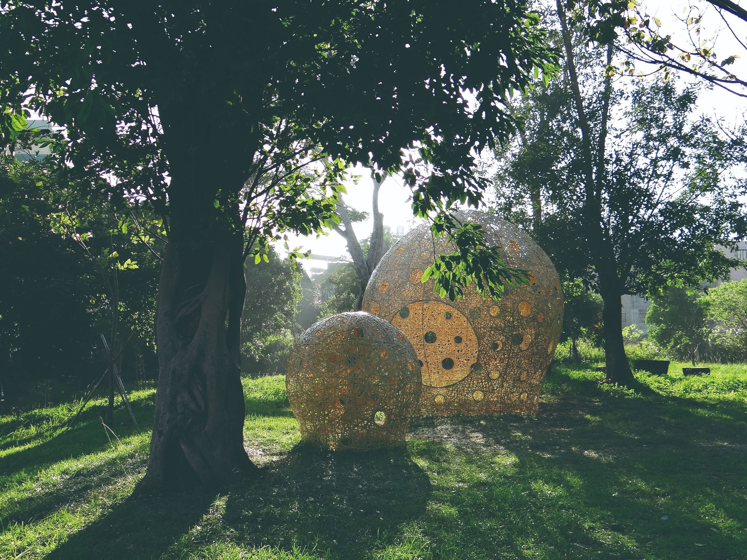 范承宗跳脫以往做小物件的手法,打造足以讓人在其中走動的大型竹編創作,採用編織容器時製作開口的輪口編搭配自由編織手法,創作出一大一小的不規則圓形主體,相依相隨的造形,呼應周邊區民的溫馨親密關係。考量新竹以風大聞名,編織手法選用大小不一的圓口編,可讓風快速通過並減少風阻,而組織成類似蕾絲的自由編織,在白天時可以讓光線自由穿透灑落,讓人浸淫在柔和的溫暖中,而晚上只要打開燈光,就宛如一盞在森林中發光的精靈。
