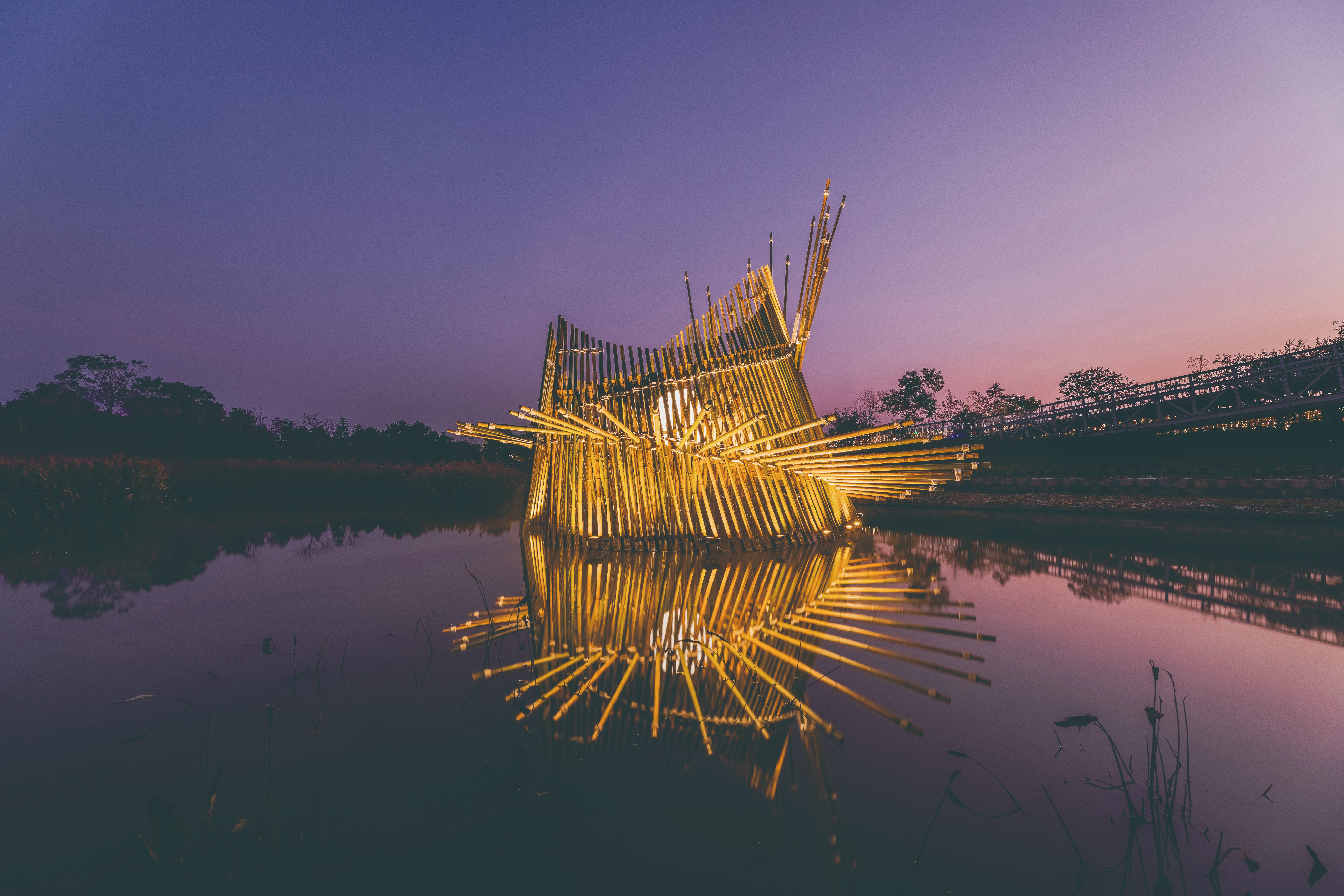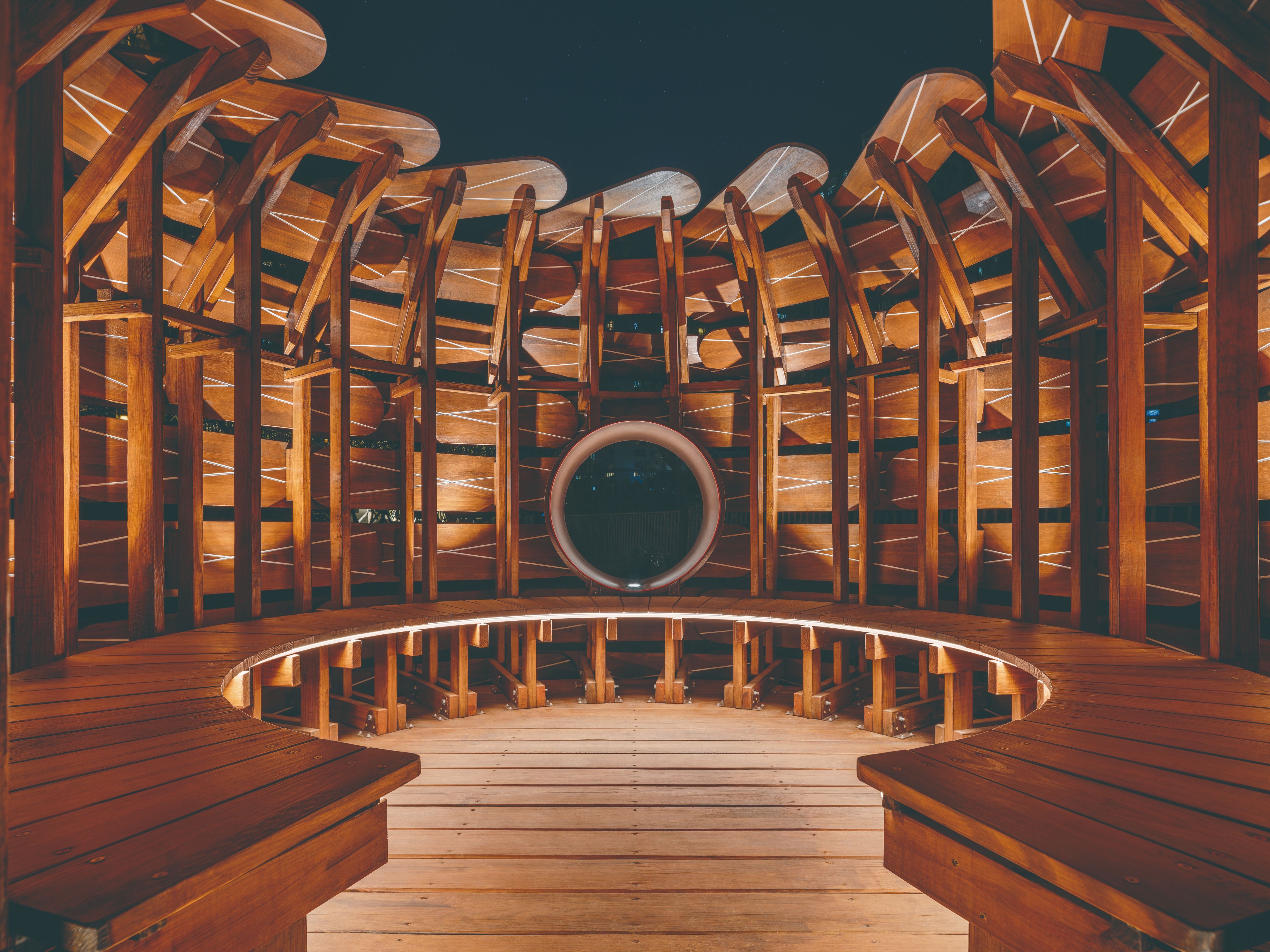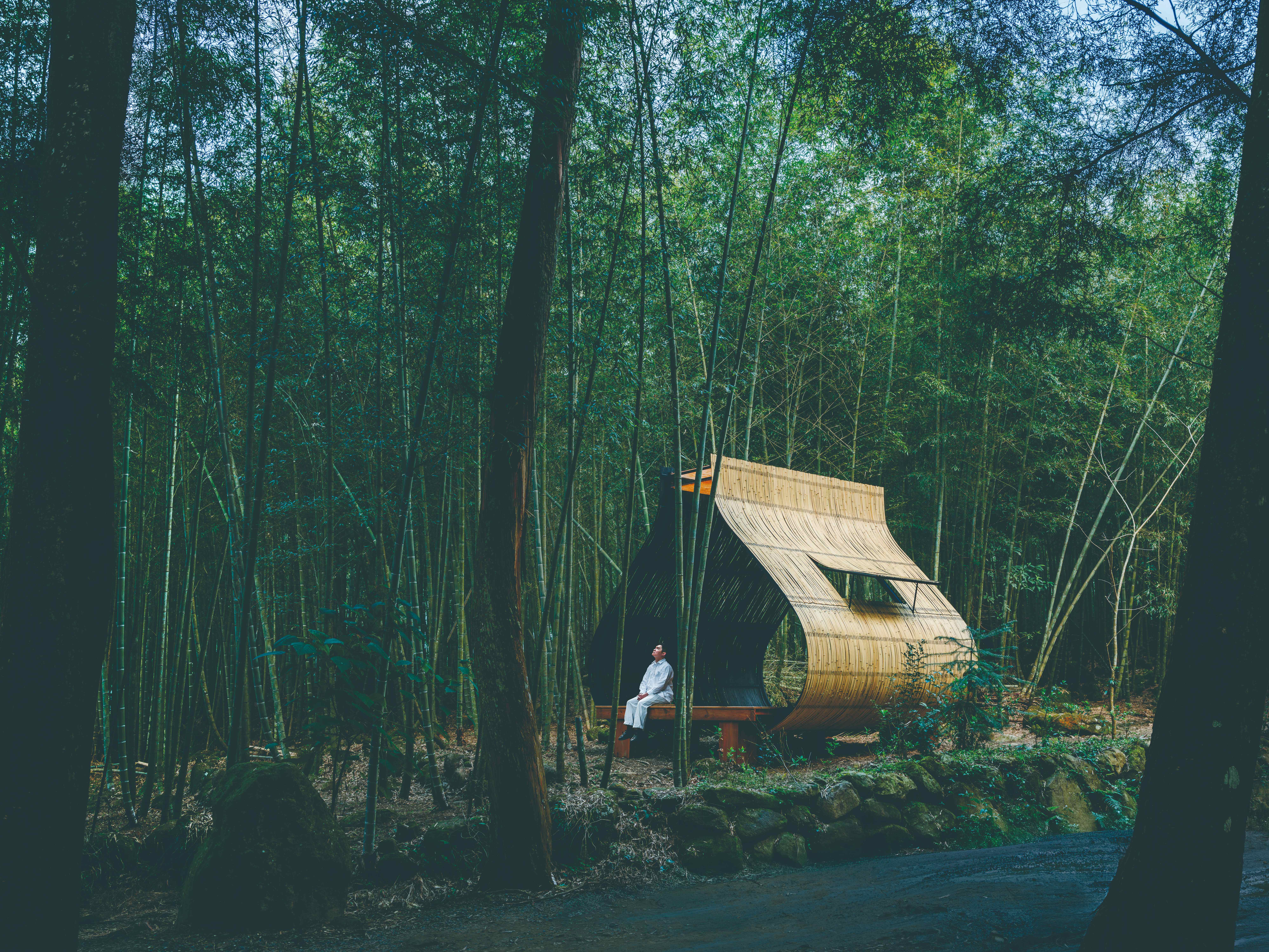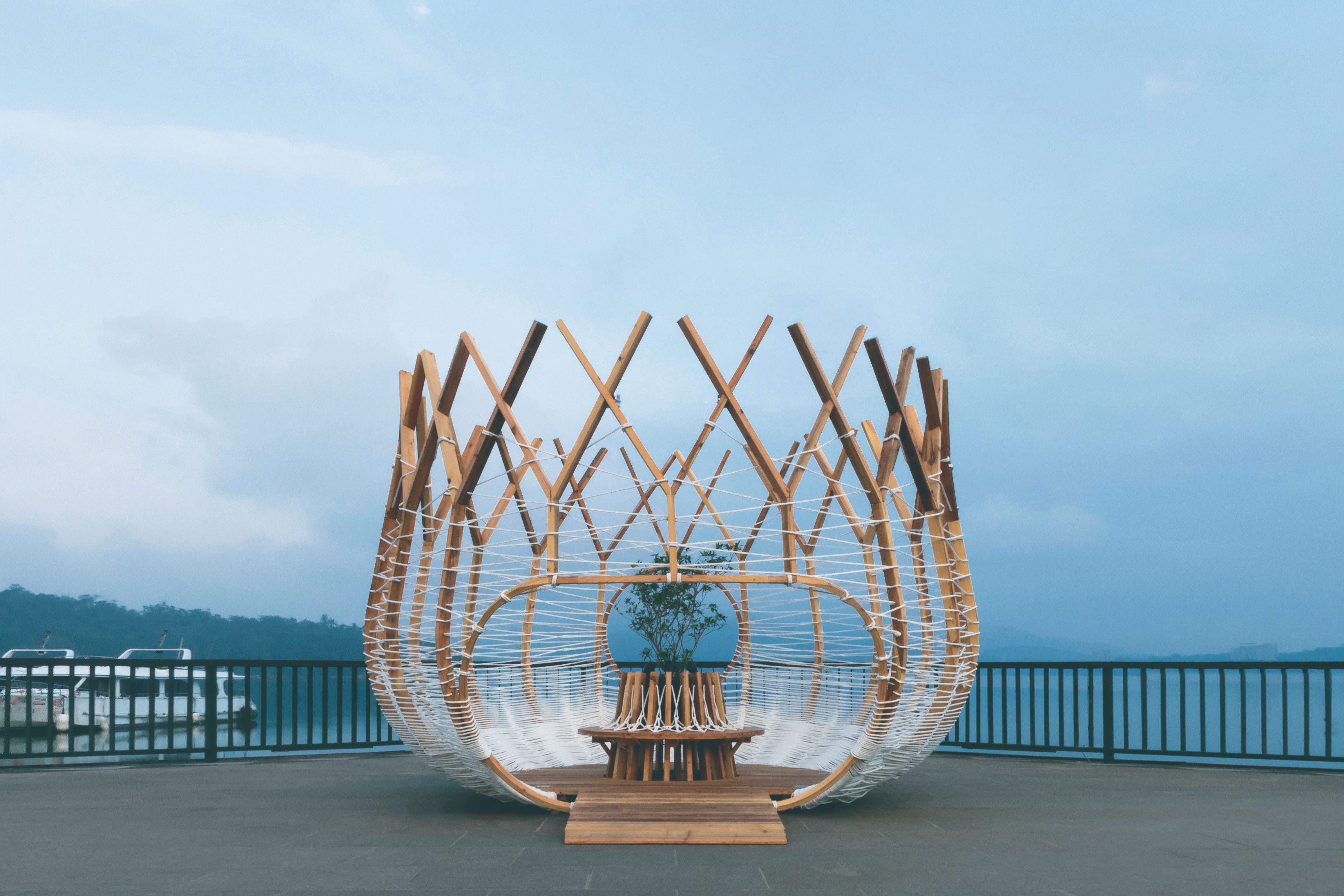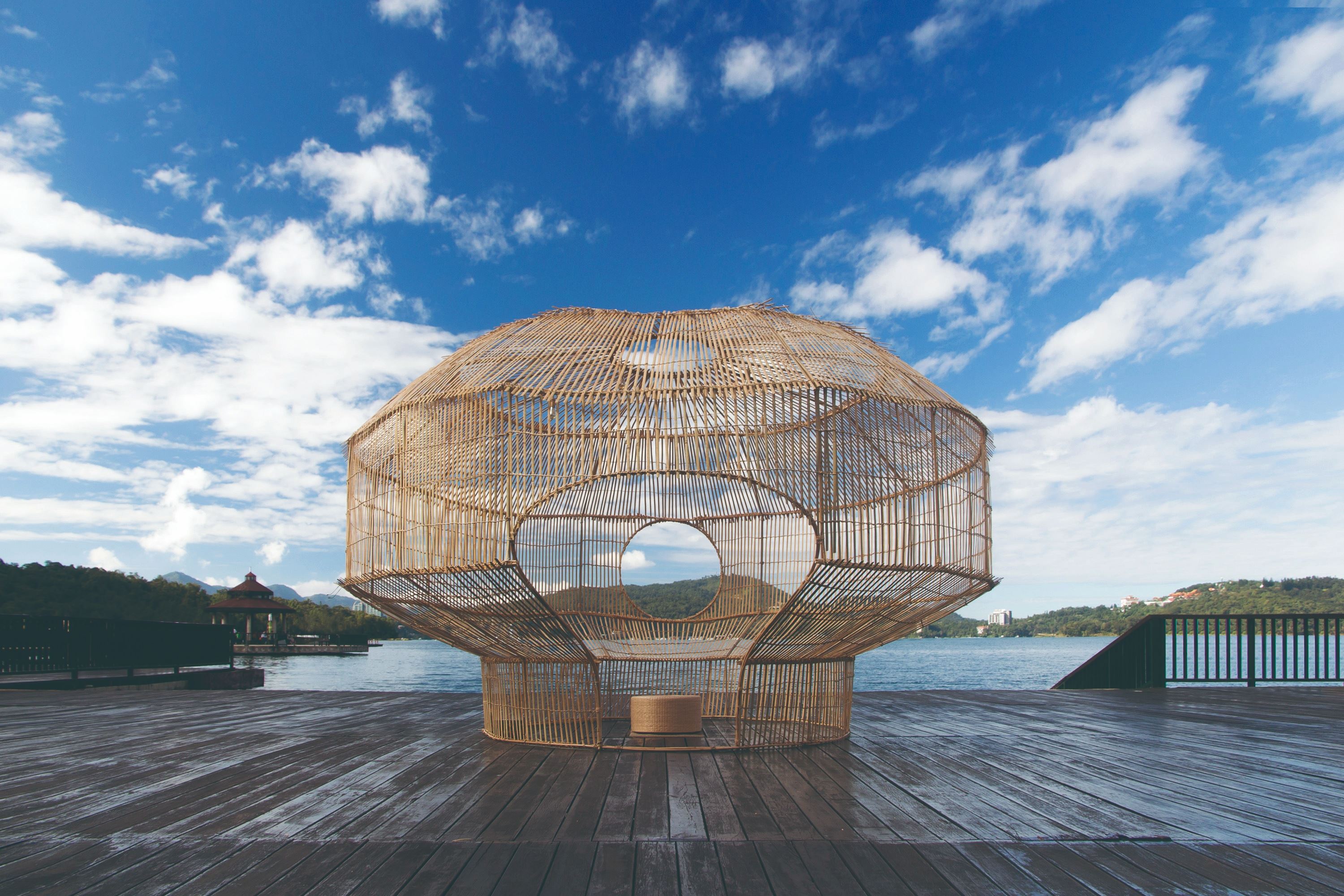 就像第一號《築巢計劃》,范承宗將當地原住民族邵族的靈鳥繡眼畫眉作為靈感,拆解出繡眼畫眉築巢的層層遞進的流程:擇枝、聯繫、草葉、花序、軟墊等,以臺灣柳杉、彰化永靖製造的白繩為材,重新創作出一座落地於日月潭伊達邵碼頭的大型空間裝置,隨著白繩與柳杉編織而成的紋路由密到疏,往上越是穿透的特色,空隙之間納入了當地大片的湖光山色,像是把日月潭也編織進去,而旅人也可在其間穿梭休憩,人與《築巢計劃》因互動而進入彼此的生命中。