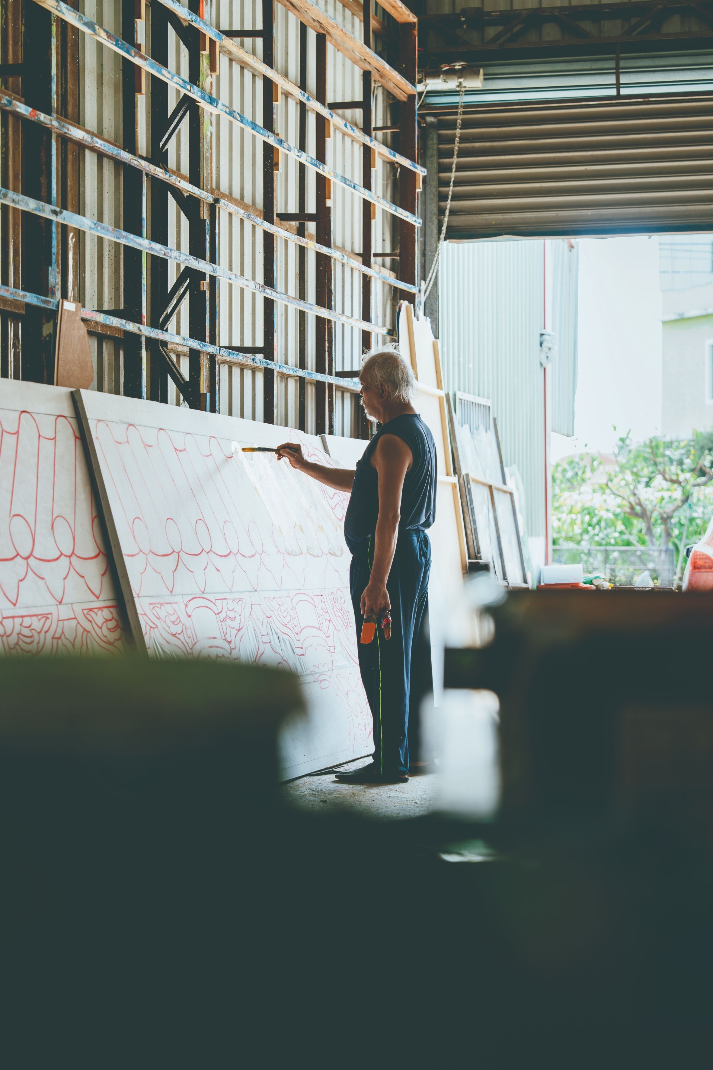 這份直觀的訓練,讓他對布景有著超乎常人的敏銳直覺,也孕育出獨特的創作眼光。長時間的蹲跪站立、專注揮筆、用心混色與細心調光,這些容易被觀眾忽略的細膩工作,每一筆都蘊含著深刻的職人精神。